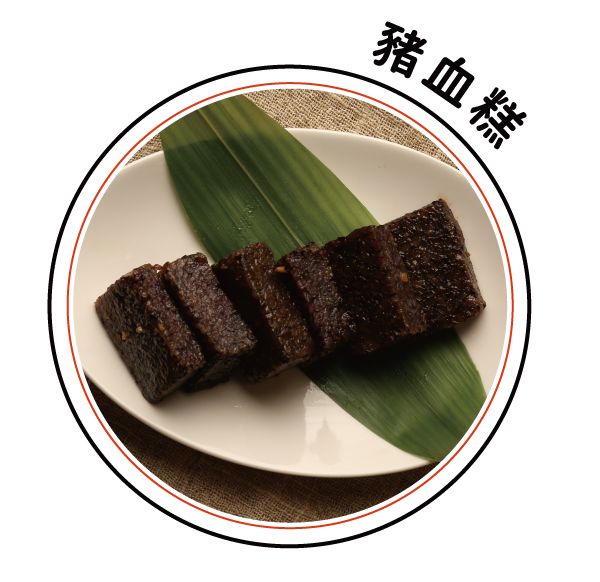 手工豬血糕,供應商為70年老店,採用濁水溪糯米、屠宰場鮮送豬血,無添加防腐劑與化學物料,遵循古法手工製作,口感Q彈。