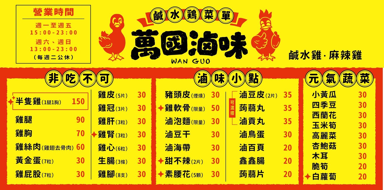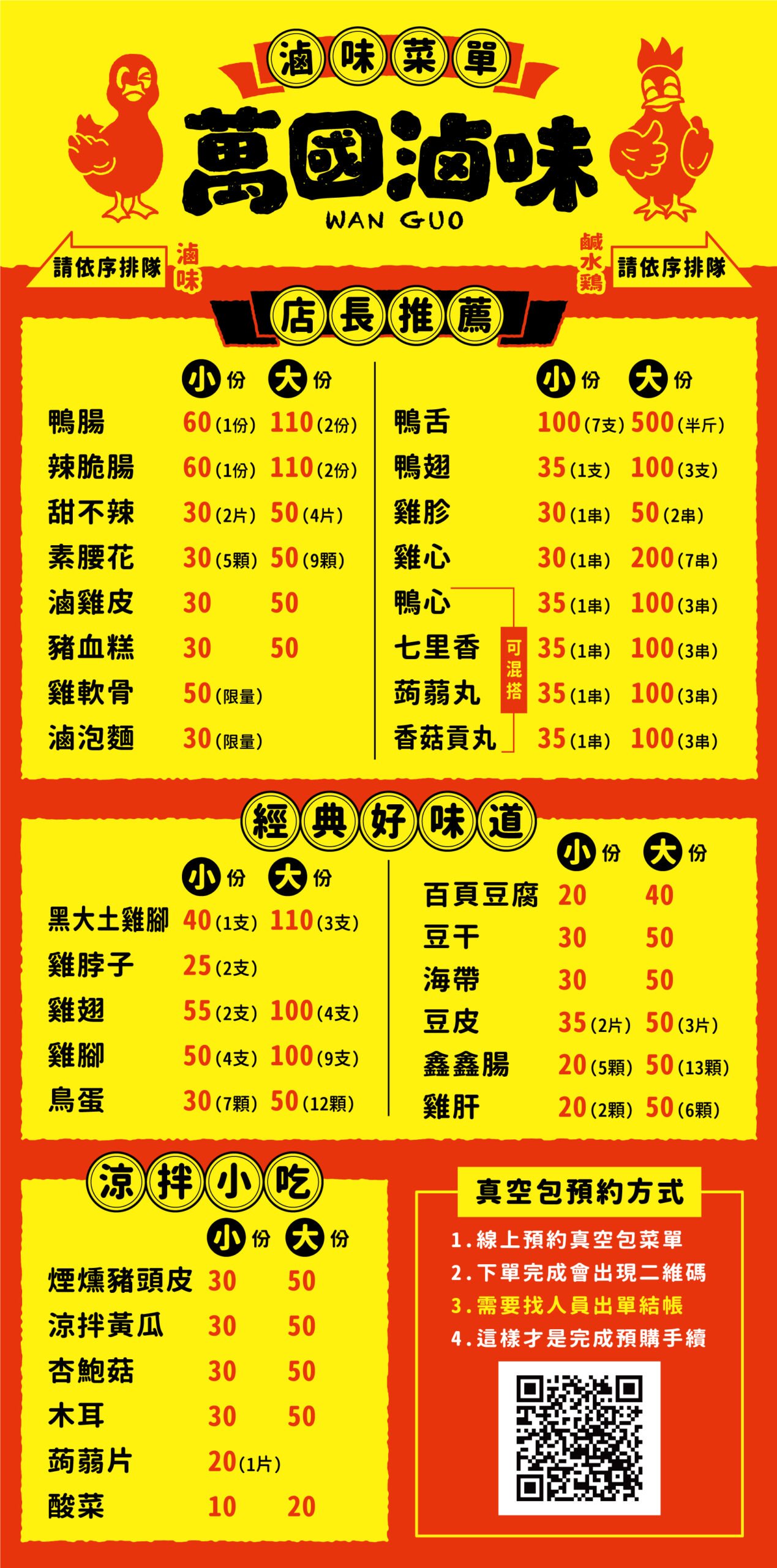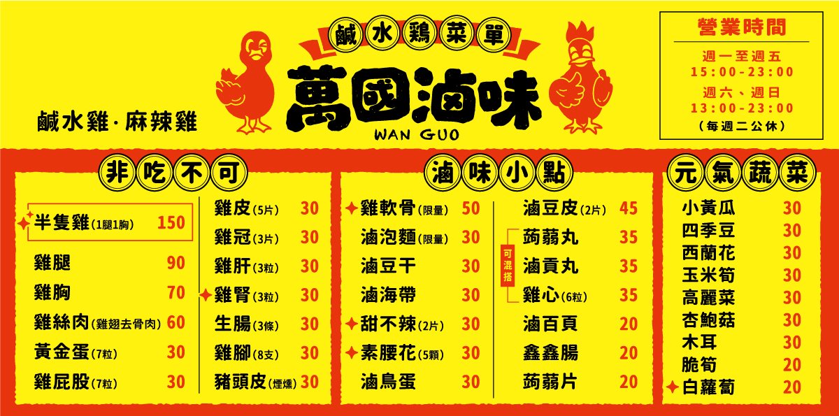 上面菜單所列商品價格可能變動,實際價格請以現場銷售為準。 我們提供線上預約訂購服務,您可以線上Line Pay付款或至現場取貨付款♦ 線上鮮食預訂(限當天)→ 請按此♦ 線上真空包裝預訂 → 請按此 線上預訂完成,請將訂單截圖,傳至萬國滷味官方Line@,以方便我們核對如需快遞到府服務,請透過萬國滷味官方Line@聯繫我們,我們會為您安排